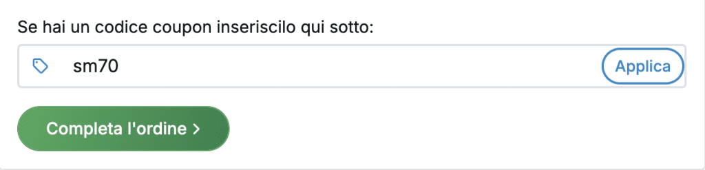 Accedi al corso utilizzando un codice sconto esclusivo del 70%! Aggiungi il corso nel carrello, inserisci il codice coupon sm70 nell’apposito spazio e clicca su Applica per utilizzare la promozione come nell’immagine sotto. Attenzione, questa speciale promozione è valida SOLO PER I PRIMI ISCRITTI – SOLO PER UN TEMPO LIMITATO! Approfittatene.